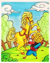 -aquí esta el caballo de oro -dijo el zorro-, pero ponle la silla de montar vieja si quieres evitar que relinche y llame la atención a los soldados.