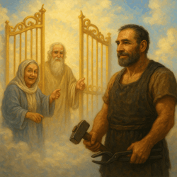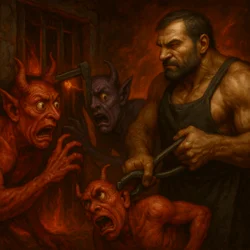 Tras la inevitable visita, patxi cogió de la herrería unas tenazas, un martillo y un asador y se encaminó rumbo al infierno. Al llegar a sus puertas las empezo a aporrear generando un gran estruendo.